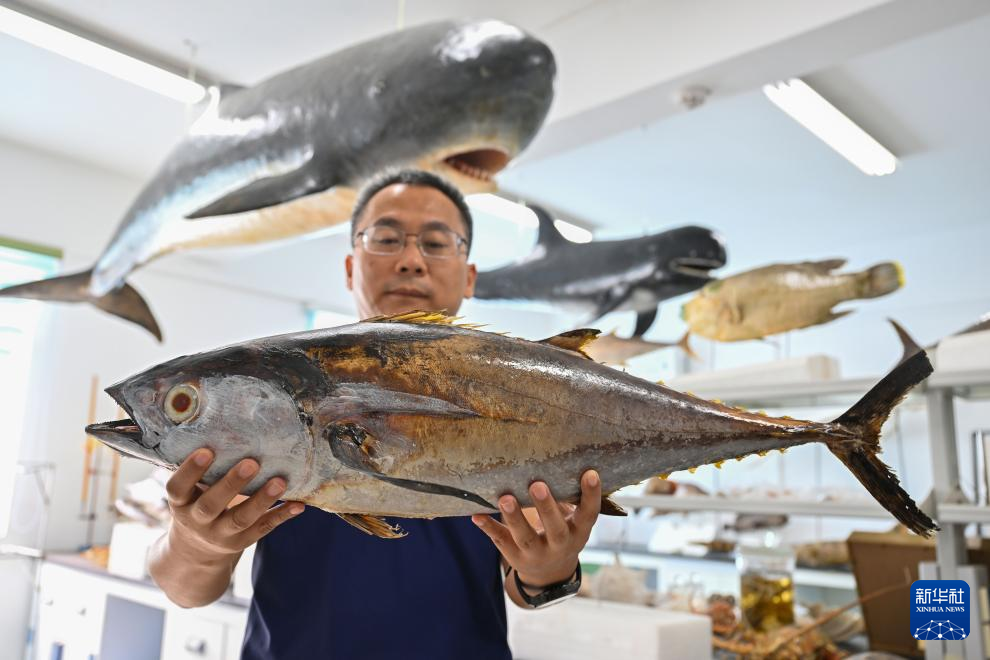 9月17日,中国水产科学研究院南海水产研究所研究员秦传新展示一尾黄鳍金枪鱼标本。新华社记者 郭程 摄