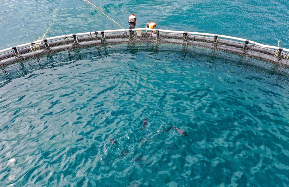 9月17日,陵水黄鳍金枪鱼海上养殖示范基地工作人员在投喂金枪鱼。新华社记者 郭程 摄
