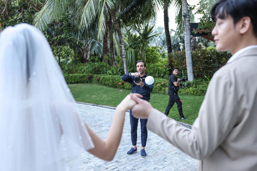他一边调整角度,一边引导新人微笑。镜头背后,他不仅在记录幸福定格的瞬间,也捕捉着法式美学与海岛风情的交融。