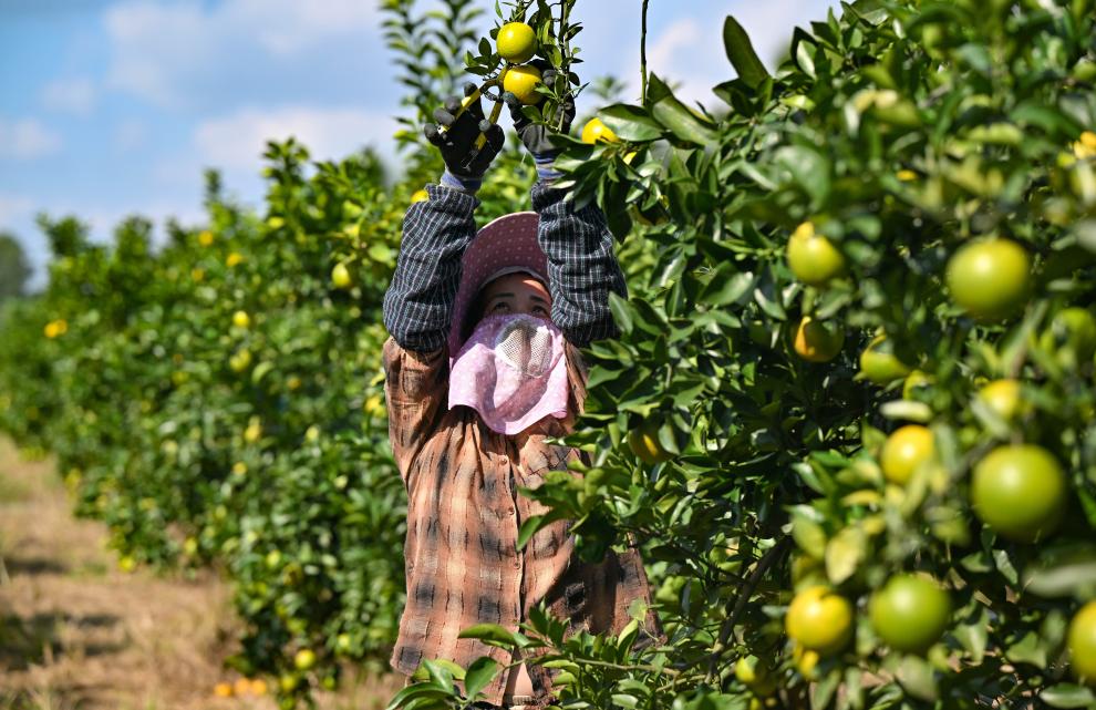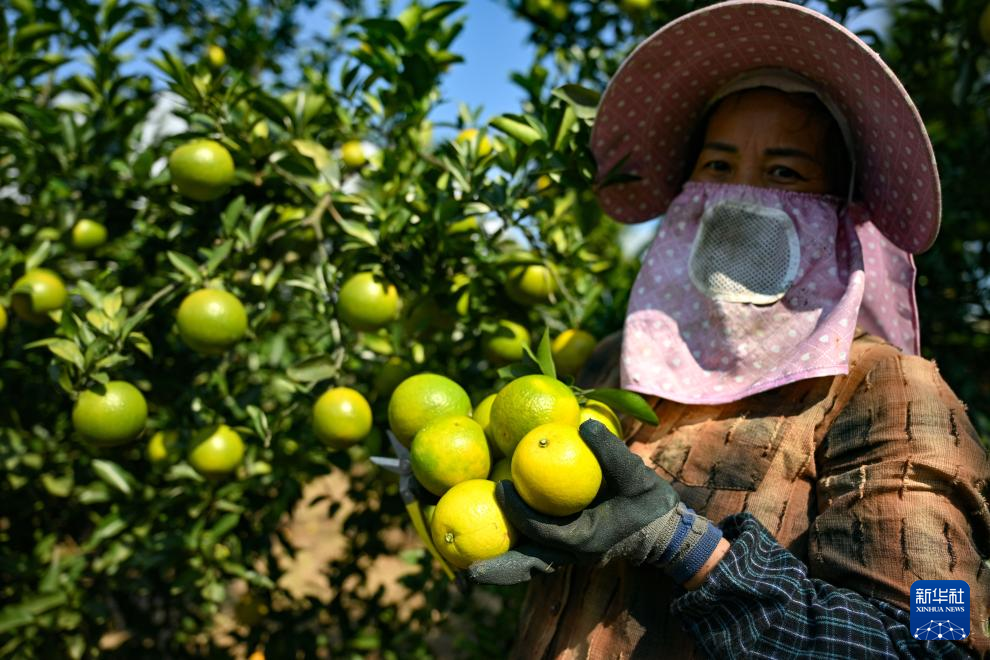 11月14日,农民在澄迈县福山镇永文村的福橙种植基地采摘福橙。新华社记者 郭程 摄