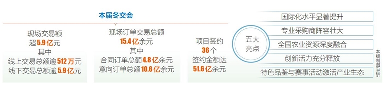 据统计,本届冬交会人流量近20万人次。现场交易额超5.9亿元,其中线上交易总额逾512万元,线下交易总额逾5.9亿元,线上线下协同联动的交易模式彰显强劲活力;现场订单交易总额15.4亿余元,其中合同订单总额4.8亿余元,意向订单总额10.6亿余元;项目签约数量36个,签约金额达51.6亿余元。全球参展商与采购商通过展会实现精准对接,有效促进了热带农产品从生产端到市场终端的高效流通,充分彰显了冬交会作为农业贸易平台的功能。