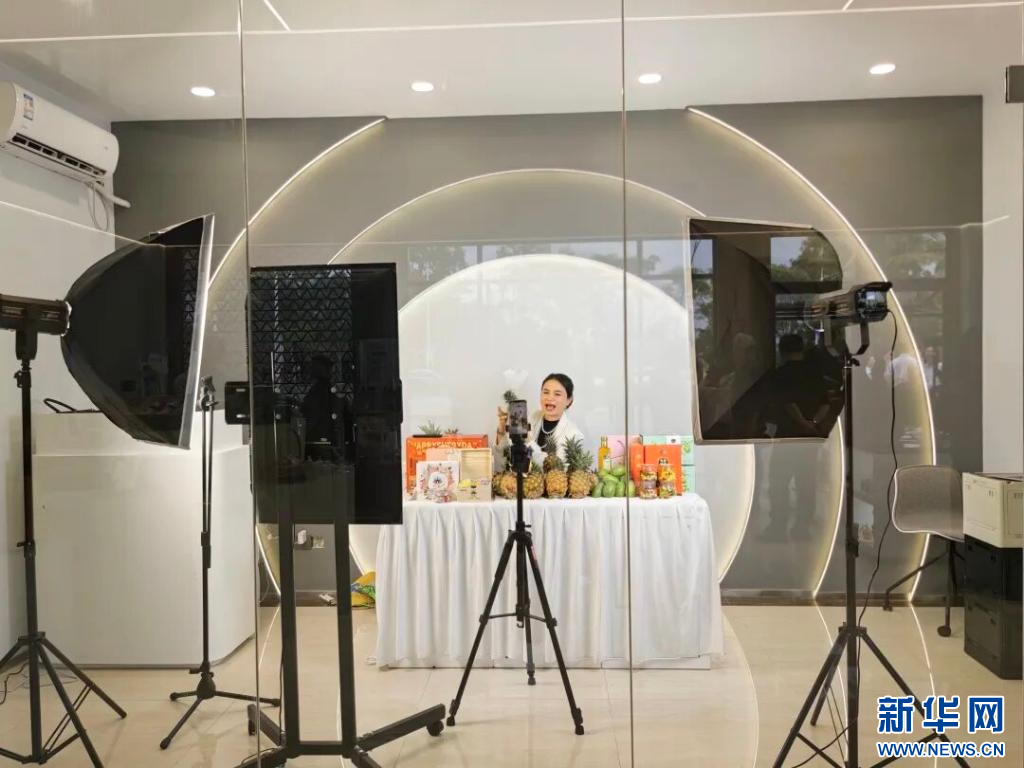 工作人员在直播间进行直播带货。